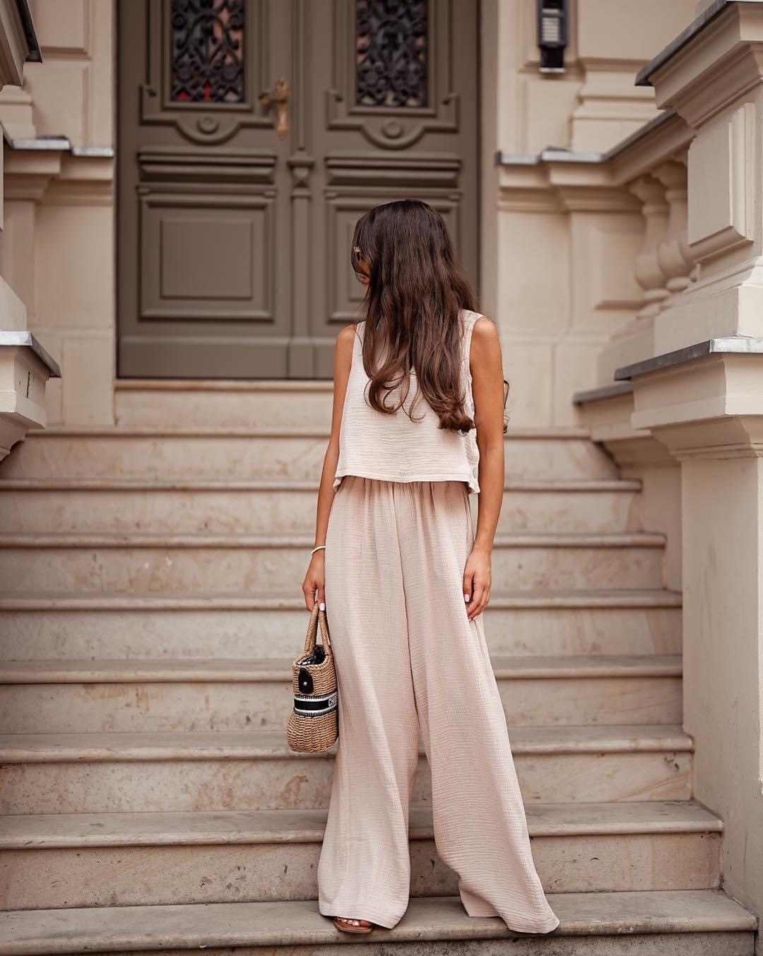 Komplet Sunny Long Beige idealny na upały. Komplet, który sprawdzi się na co dzień, a nawet na wakacje i plażę. Dobierz do niego koszyk i klapki. Po bokach posiada guziki w kolorze perłowym. Uszyty z najwyższej jakości bawełny. Uszyty w polskiej szwalni.